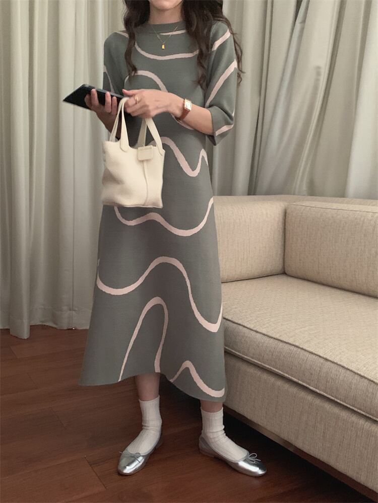 独特なシルエットに魅了される スリム 肌にやさしい ウェーブ ロングスカート 絵画 ニットワンピース