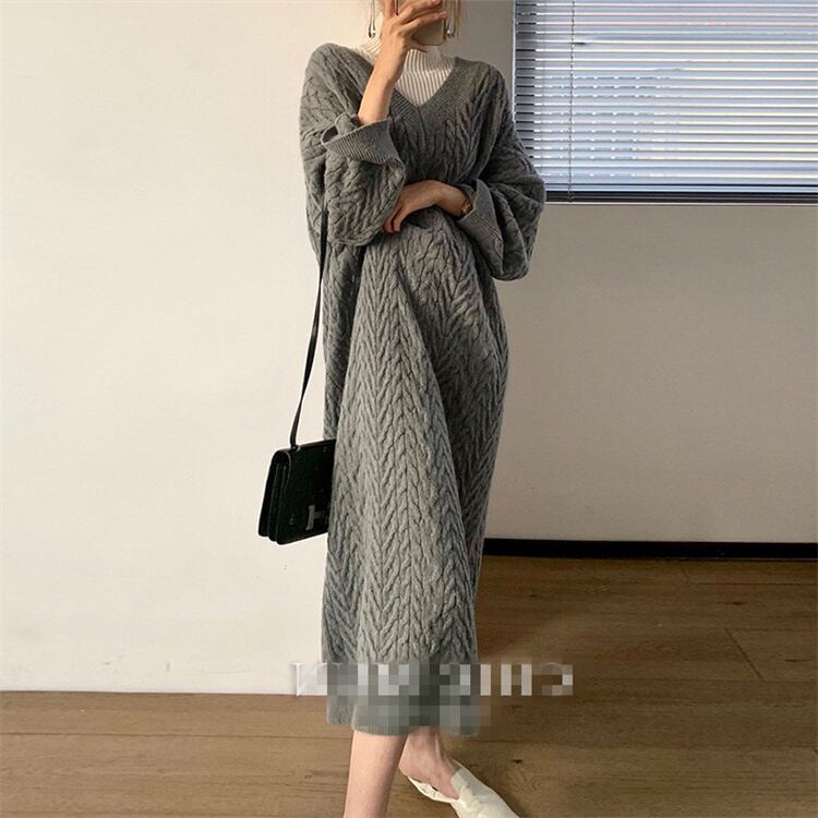 大きいサイズ 大人気 ゆったりする ワンピース 秋 Vネック 長袖 ニットワンピース ロングスカート