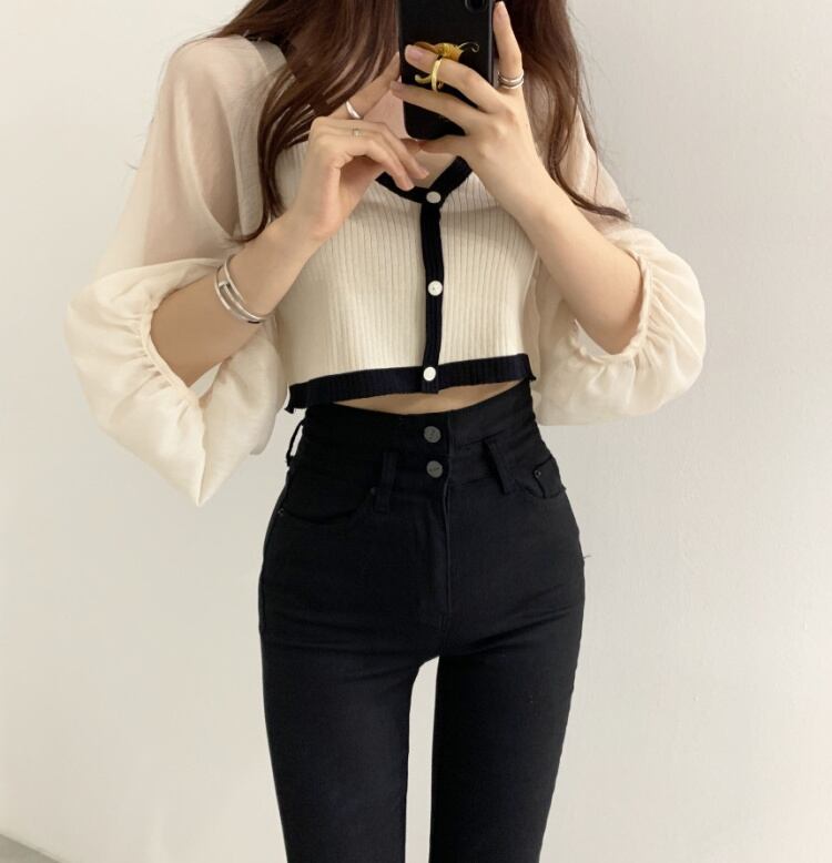 Vネック スリム シフォン 縫付 ランタンスリーブ ニットトップス カーディガン